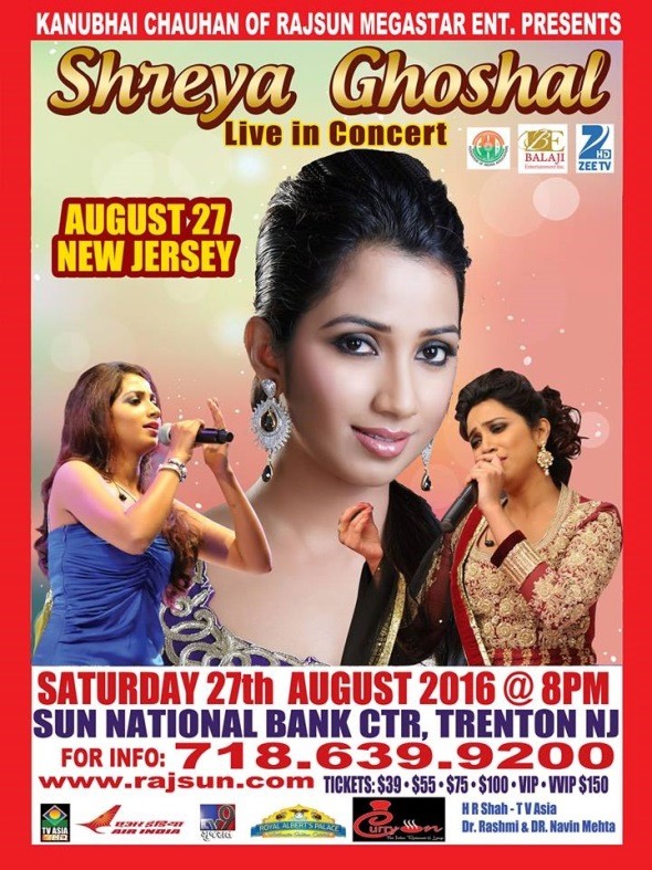 Jersey Indians are all ready for the star singer, Shreya Ghoshal’s live concert on the 27th of August at Trenton. Organized by Rajsun Megastar Entertainment, this mega event will feature the best hits from the singer, live and exclusive for the audience!